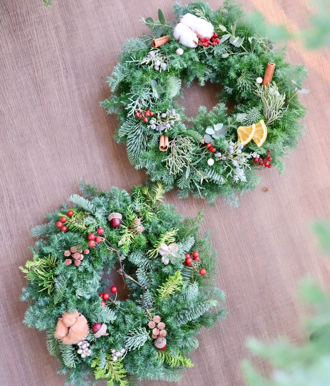 新鮮な針葉樹や風味豊かなオーナメントをふんだんに使用し、心を込めて手作りしたリース